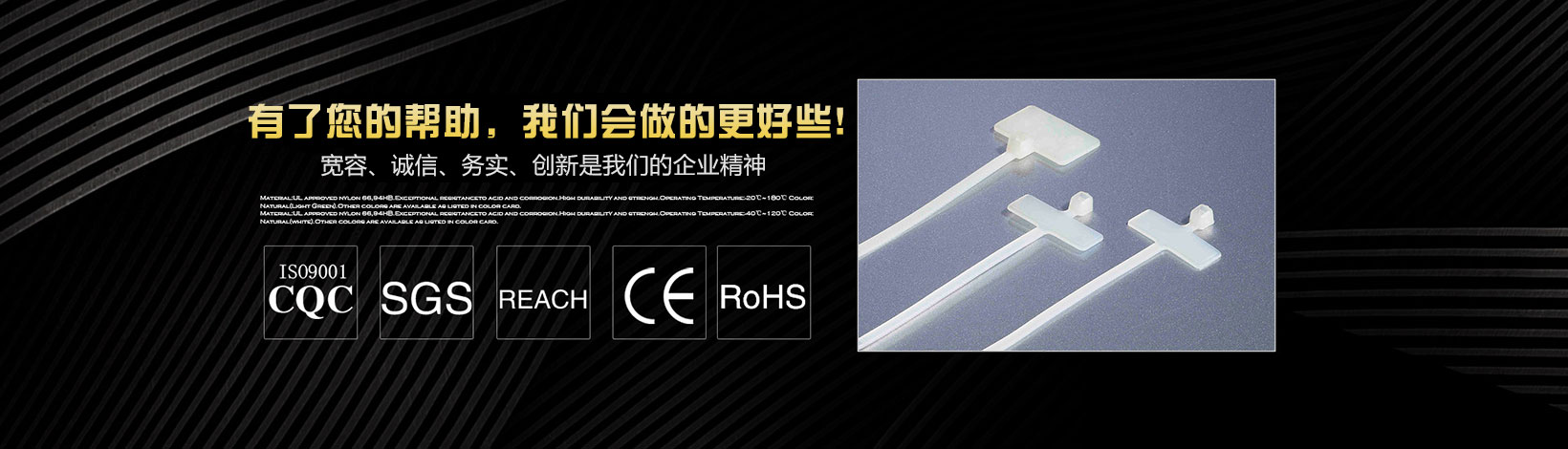 本公司專業(yè)生產(chǎn)銷售尼龍扎帶、特殊型扎帶、吸盤(自粘式定位片)、塑料膨脹管、尼龍壓線帽、電纜防水接頭、鋼釘線卡、R型線夾、飛機型線夾、瓷磚定位十字架、固定座、纏繞管、異型管、齒型管、號碼管、熱縮管、黃臘管、扎絲、鋼管蓋等系列產(chǎn)品。 我們擁有先進的檢測設備和雄厚的技術(shù)力量,并不斷優(yōu)化生產(chǎn)流程,規(guī)范生產(chǎn)環(huán)節(jié),加強完善質(zhì)量控制系統(tǒng),以優(yōu)異的品質(zhì)深得海內(nèi)外客戶的一致好評。